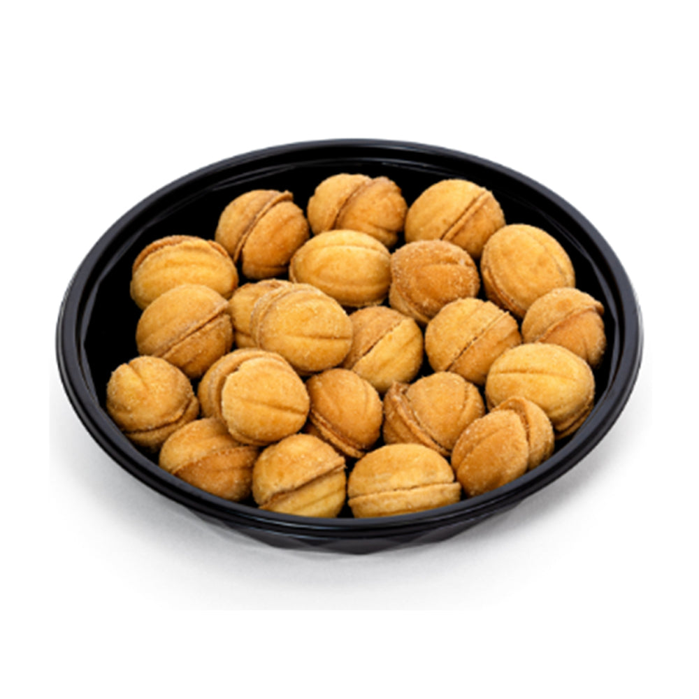 Нежные печенья в форме грецкого ореха, приготовленные из золотистой запеченной бисквитной корочки и наполненные гладким, насыщенным карамельным кремом. Каждое печенье состоит из двух легких, слегка хрустящих половинок, соединенных вместе сладкой, сливочной карамельной начинкой, которая тает во рту. Вдохновленные традиционным восточноевропейским рецептом, эти печенья предлагают идеальный баланс сливочной текстуры и карамельной сладости.